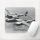 O tapete do rato foi impresso com uma fotografia de guerra real de um avião de caça-raios P-38.