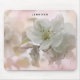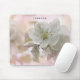 Um mouse pad com uma fotografia que apresenta um ramo de macieira exibindo suas lindas flores brancas de maçã.