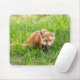 Este adorável kit de raposa vermelha senta-se em erva alta do lado de fora da toca.