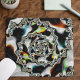 Este mouse pad apresenta uma arte fractal espiral abstrato, psicodélica em preto e branco com sotaques amarelos, laranja, azuis e verdes.