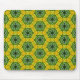 Um padrão geométrico baseado em elementos de flores reais que tem uma forma de floco de neve gelado no centro de um hexágono verde circulado com pétalas amarelas quentes como formas. Meio que me lembra uma geada leve em uma manhã de verão tardia.