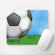Feche acima da ilustração de um futebol que descansa em cima de um campo da grama. A bola é projetada baixo à terra. Há igualmente um espaço no céu para adicionar uma mensagem de texto se você deseja a. Imagem disponível em vários presentes e produtos.