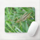 Este brilhante bocal apresenta uma macro fotografia detalhada de um pequeno gafanhoto verde com marcas marrom manchadas sobre a grama. Na fotografia você pode ver os detalhes das pernas unidas, longas antenas e olhos pretos e dourados do gafanhoto.
