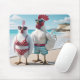 Uma cena branca mostra duas galinhas brancas antropomórficas vestidas de roupa de praia e óculos de sol numa praia.