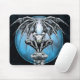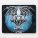 Uma gárgula de pedra senta-se sobre um suporte quebrado com suas asas espalhou largamente. Um círculo azul nebuloso molda o corpo com um fundo preto atrás.
