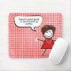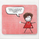 Bonita figura de palito com uma caneca de café branca, cabelo, colar de pérolas, e citação divertida sobre um fundo de gingham vermelho e branco. A citação é editável.
