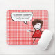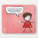 Bonita figura de palito com uma caneca de café branca, cabelo, colar de pérolas, e citação divertida sobre um fundo de gingham vermelho e branco. A citação é editável.