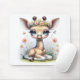 Uma girafa de bebê fofinha com grandes olhos azuis veste uma coroa de flores e está cercada por flores e borboletas cor-de-rosa