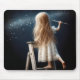 Uma menina loira, com um delicado vestido de renda, fica sobre uma escada de madeira pintando estrelas no céu noturno com uma escova
