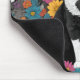 Um gato preto e branco senta-se cercado por uma abundância de flores brilhantemente coloridas em tons de laranja, azul, rosa e amarelo. O fundo é repleto de um padrão floral denso e intrincado que destaca os olhos amarelos cativantes do gato.