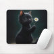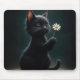 Um gatinho preto se senta, segurando suavemente uma margarida branca nas patas, com uma expressão calma e curiosa