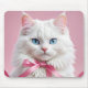 Gato branco com olhos azuis e arco cor-de-rosa isolados sobre fundo rosa