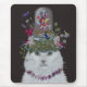 Gato, branco com vidro de borboleta, a preto pela FabFunky. Possui um gato branco fabuloso com pássaros, verde e borboletas sobre sua cabeça. | 191532D