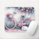 Uma bicicleta rosa se inclina contra uma parede de pedra com flores rosa e um gato branco