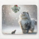 Um gato fofo e um rato minúsculo olham para um bando de conterrâneos adornada com um arco vermelho enquanto os flocos de neve caem suavemente ao seu redor