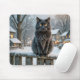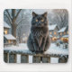 Um gato preto liso com olhos amarelos flagrantes senta-se sobre uma cerca de madeira de neve, cercada por uma vila pitoresca de inverno