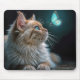 Um gato fofo com olhos azuis impressionantes espanta-se curiosamente com uma borboleta brilhando por perto