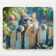 Um gato-cinza peludo espreita sobre uma cerca azul-meteorizada, cercado por um verde-luxuoso e flores vibrantes