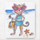 Esta é uma pintura mestiça de um gato branco em óculos de sol na praia.