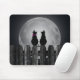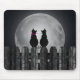 Par de gatos pretos na cerca com caudas enroladas em forma de coração olhando para uma lua de cheio.