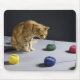 Ginger Tabby cat sentado na mesa olhando bolas de lã | Michael Blann | ID do ativo: sb10069719m-001