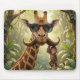 Uma selva vibrante onde uma girafa caprichosa ostenta um grande bigode, adornada de forma lúdica com um macaco pendurado, tudo sob o brilho quente da luz solar
