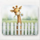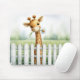 Uma girafa divertida espreitando sobre uma cerca branca de piquete com uma margarida na boca.