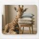 A tired giraffe leans against a stack of pillows on a wooden table, basking in the warm glow of sunlight that filters through a nearby window