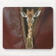 A cabeça de uma girafa espreita através da abertura de um zíper em couro marrom