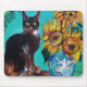 Gato preto expressivo e branco, girassóis coloridos e folhas verdes em cores azul-amarelo e azul-turquesa. Pintura acrílica original, artística e vibrante, em painel de madeira, de Búlgaro Lumini (c)