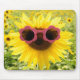 Girassol amarelo vestindo óculos de sol rosa e bolinhas branca em um campo de girassol.