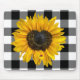 Girassol amarelo com centro em forma de coração e joaninha na xadrez de búfalo preto e branco.