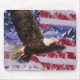 Uma imagem belamente patriótica de um pássaro americano da águia americana que sobe sobre montanhas cobertos de neve, em uma bandeira americana de ondulação limitada com neve e gelo congelados. A foto congelada da bandeira foi tomada pelo fotógrafo afiado-eyed observador, Roubo Boyer.