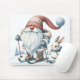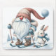 Um gnomo barbudo de aquarela branca com um chapéu de inverno que esquia com um belo coelho em flocos de neve.