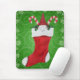 Este mouse pad é verde com espirais verdes e leves e bordado com flocos de neve rico com uma pelagem vermelha e branca esfarelando o natal que tem um pequeno gnomo e doces no topo com dois aglomerados de folhas verdes e ocas.