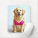 A golden retriever is sitting and wearing a bright pink bra, looking directly at the camera with a cheerful expression