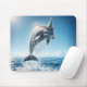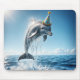 Um golfinho salta alegremente da água, vestindo um chapéu colorido, sob um céu azul claro