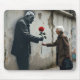 Uma idosa estende a mão em direção a um mural de um homem que oferece uma rosa vermelha vívida em uma parede de meteoros