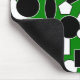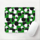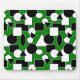 Este mouse pad tem um design Bauhaus de triângulos, círculos, retângulos e pentágonos em preto e branco num campo de verde.