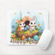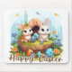 Deux adorables lapins venus fêter Pâques, sortent de leur terrier et apportent de magnifiques œufs décorés