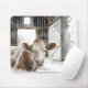 Uma vaca de cor aquosa Hereford num celeiro com porta aberta e luz solar.