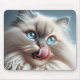 Um gato Himalaia fofo com olhos azuis brilhantes é capturado lambendo seu nariz.