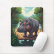A solitary hippopotamus stands by a calm river, surrounded by lush greenery. The scene captures the serenity of nature under a bright sky.