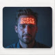 Um homem caucasiano com um sinal luminoso de "motor de verificação" na testa