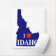 Uma silhueta azul, ou mapa, do estado de Idaho com o slogan "I Heart (Love) Idaho." Venha visitar o Estado Gem