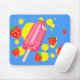 Um bocal com um tema de verão. Projetado com picolé cor-de-rosa e alguns morangos vermelhos caindo ao redor do picolé juntamente com alguns plasmas de tinta amarela. Fundo azul.