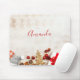 Um mouse pad com uma fotografia rústica. Um conselho de madeira marrom-claro com vários elementos de Natal ao longo do fundo.