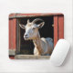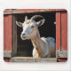 Uma cabra com chifres curvos a espreitar de uma janela de celeiro velha e curvada