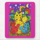 Estes três gatos coloridos estão sentados em um jardim vibrante no meio da noite, cercados por pequenas flores multicoloridas no chão e flores vibrantes altas acima delas. Fireflies buzz e uma lua crescente brilham em um céu roxo cheio de estrelas.