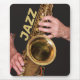 Para fãs de música jazz! Acelere o espaço de trabalho do seu computador com este mouse orientado verticalmente que apresenta a foto de um jazzman tocando seu chifre saxofone, cor dourado e vestido no tempo, junto com a palavra "JAZZ" impressa em letras douradas e em negrito.